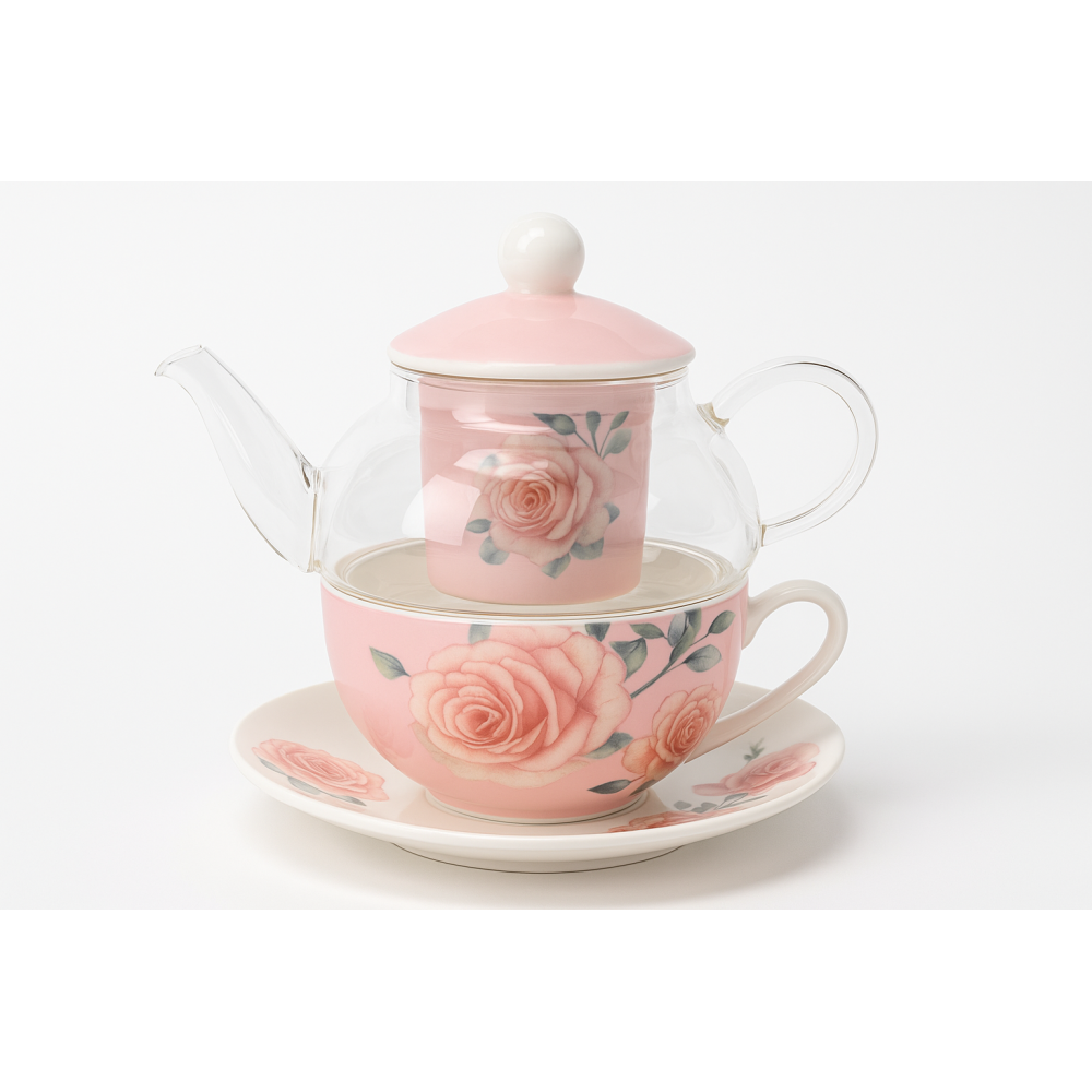 W skład kompletu wchodzi imbryczek, filiżanka oraz porcelanowa podstawka, tworząc piękną i praktyczną całość.