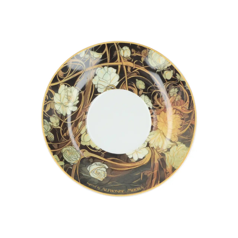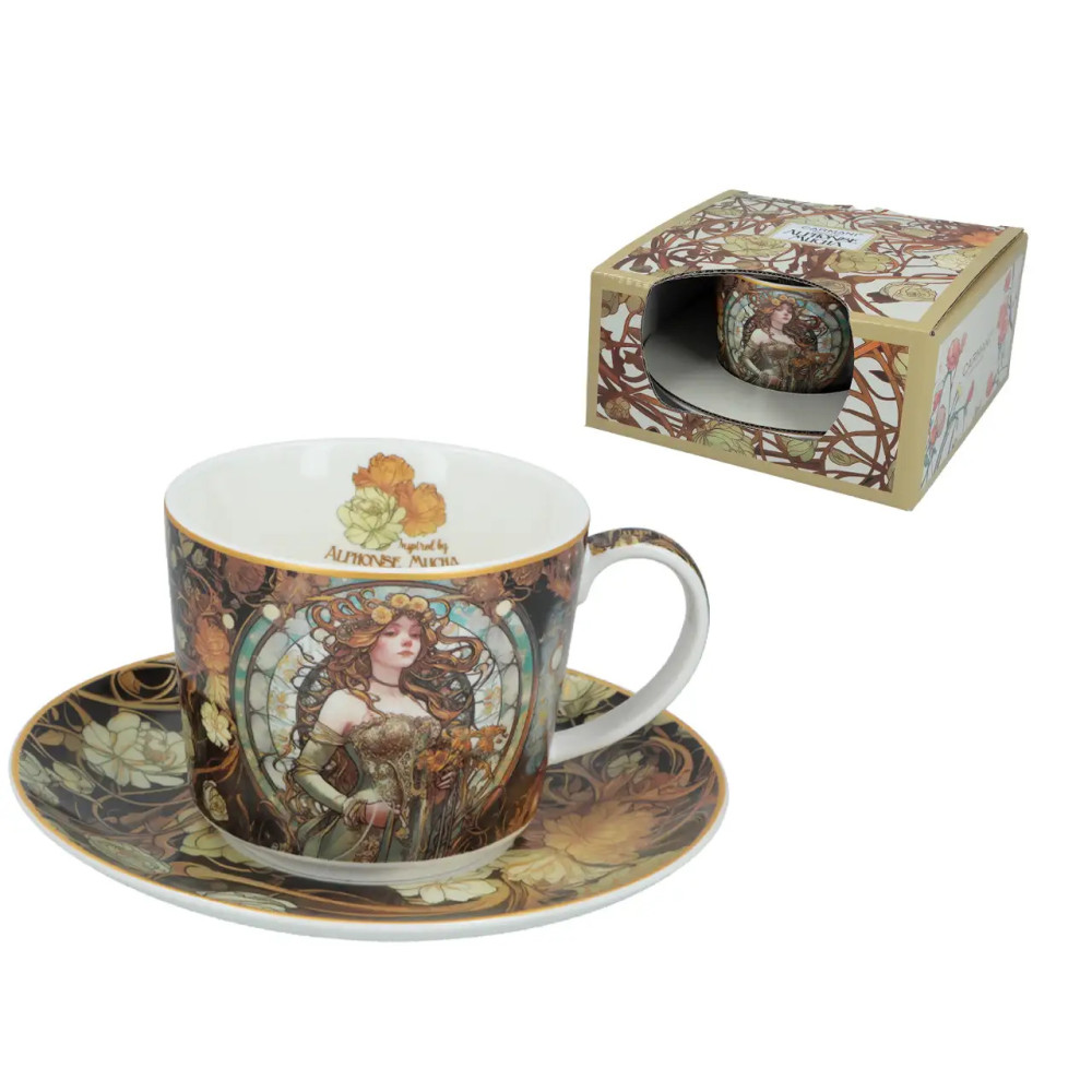 Porcelanowa filiżanka 230 ml ze spodkiem Carmani „Inspirowana Alfons Mucha” – motyw artystyczny, wysokiej jakości wykonanie.