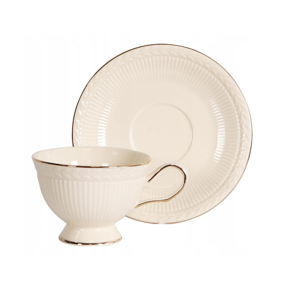 Przedstawiamy elegancki zestaw 6 filiżanek ze spodkami, idealny na każdą okazję. Filiżanki wykonane z wysokiej jakości porcelany w subtelnym kremowym odcieniu, ozdobione delikatnymi żłobieniami i złotym wykończeniem. Ich klasyczny kształt na podstawie dodaje wyjątkowego uroku i elegancji, która zachwyci każdego miłośnika pięknych dodatków.