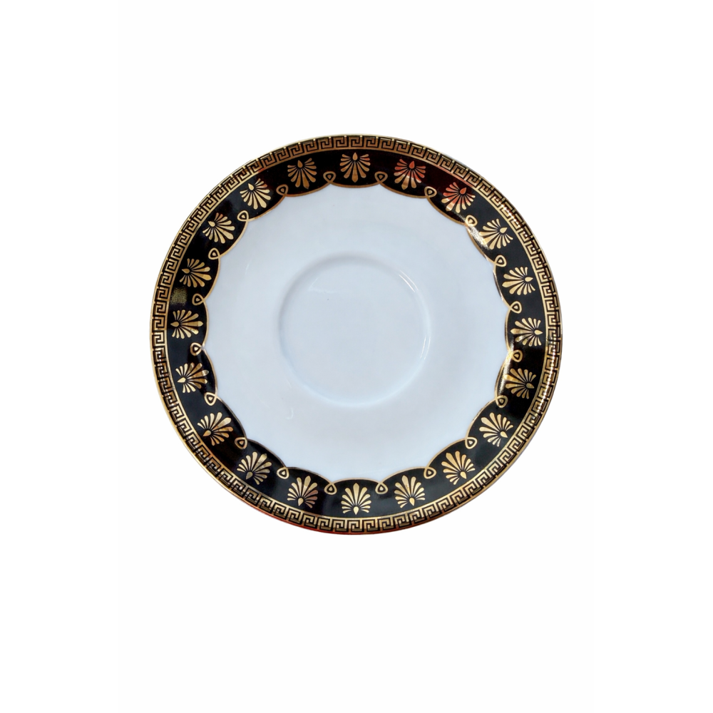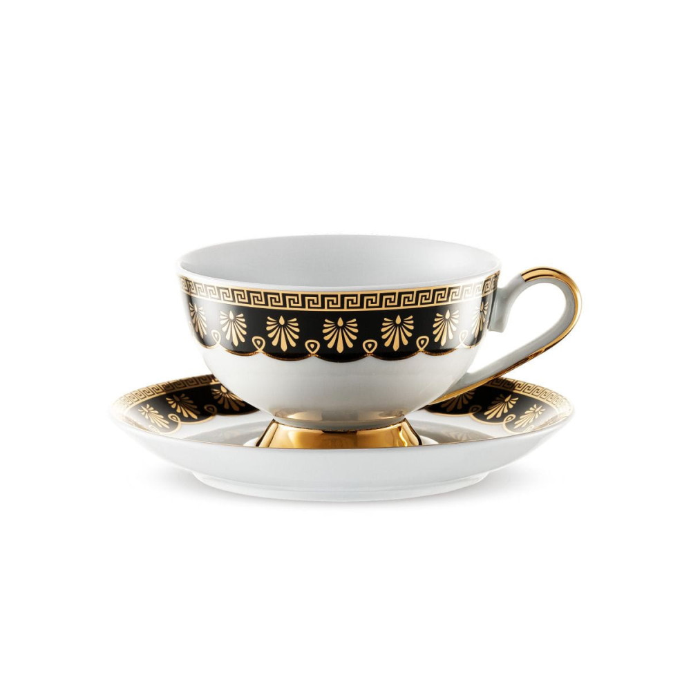Filiżanka ze spodkiem Ćmielów Astra Ellada zachwyca klasycznym wzornictwem i szlachetnym wykończeniem. Wykonana z wysokiej jakości porcelany, łączy prostą, elegancką formę z dekoracją inspirowaną antycznym stylem. Czarno-złoty ornament pięknie kontrastuje z bielą porcelany, nadając całości luksusowego i wyrafinowanego charakteru.