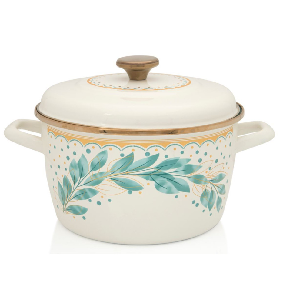 Metalac Green Line 24 cm / 6,0 l to duży garnek emaliowany, idealny do przygotowywania obfitych porcji zup, gulaszy czy innych dań jednogarnkowych. Wykonany z trwałej stali pokrytej emalią, z pokrywką w zestawie i dekoracyjnym motywem roślinnym w jasnych tonach.