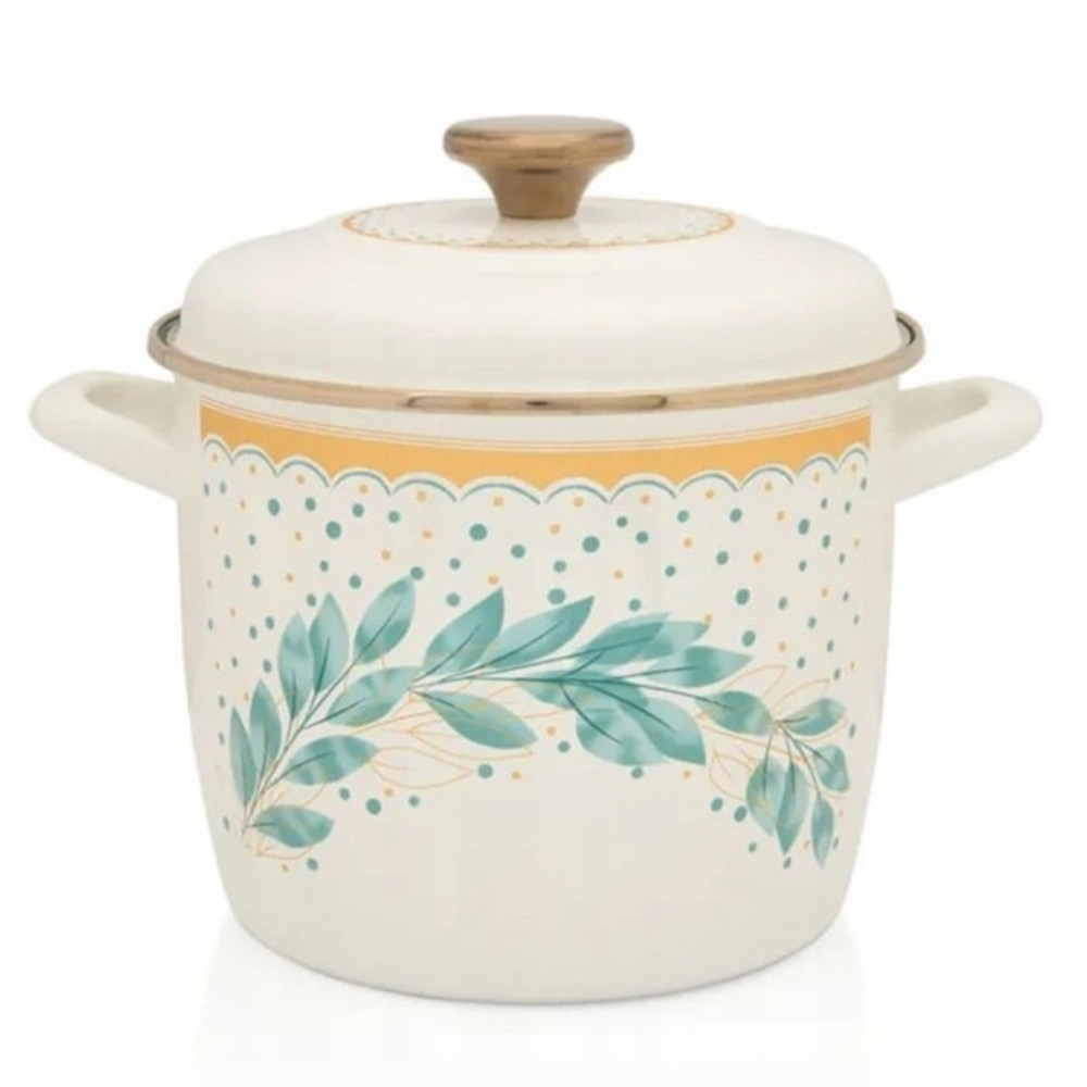 Garnek z linii Metalac Green Line, o średnicy 20 cm i pojemności 5,1 litra, wykonany z klasycznej stali pokrytej trwałą emalią. Idealny do przyrządzania zup, potraw jednogarnkowych, sosów czy duszenia. Estetyczny kremowo-miętowy kolor oraz dekor roślinny dodają mu elegancji, a złote detale sprawiają, że stanie się ozdobą Twojej kuchni.