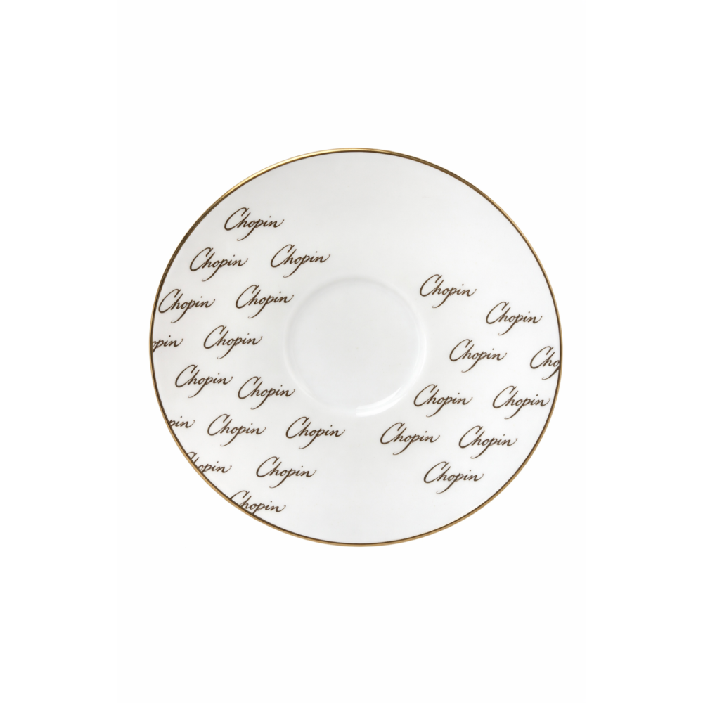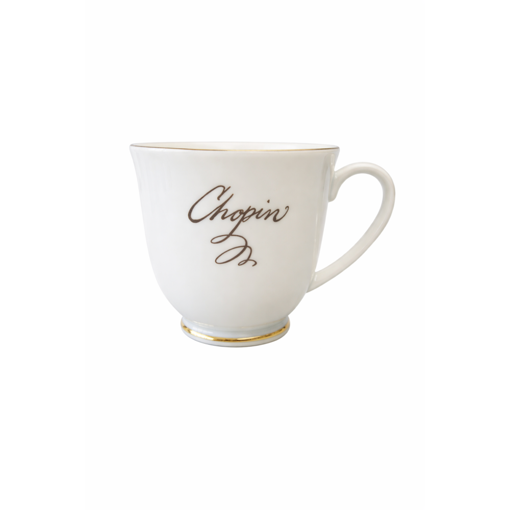 Ta filiżanka ze spodkiem marki Bogucice to hołd dla jednego z najwybitniejszych polskich kompozytorów. Minimalistyczna, biała porcelana została ozdobiona eleganckim, kaligraficznym podpisem Fryderyka Chopina oraz delikatnymi złoceniami na rantach, które nadają całości wyjątkowej klasy i szlachetności.