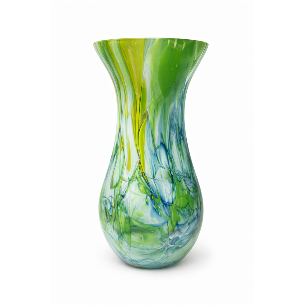 Szklany wazon dekoracyjny o wysokości 25 cm to niezwykle stylowy element wystroju wnętrza. Wykonany z wysokiej jakości szkła, zachwyca dynamicznym połączeniem zieleni, błękitu i żółtych akcentów, które tworzą niepowtarzalny, artystyczny efekt. Każdy egzemplarz posiada unikalny układ wzoru, dzięki czemu wazon jest jedyny w swoim rodzaju.