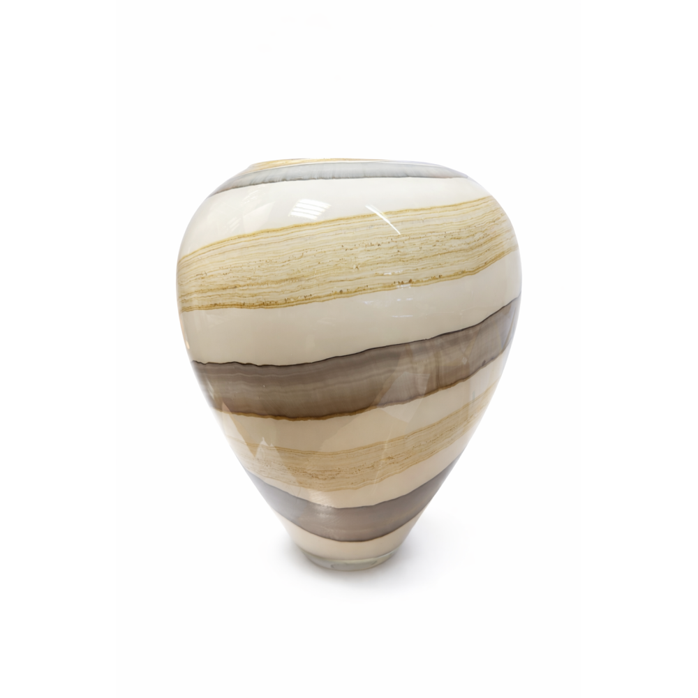 Połączenie kremowych, beżowych i szarych pasów nadaje mu luksusowy charakter. Zaokrąglona, harmonijna forma sprawia, że wazon pięknie prezentuje się zarówno z bukietem kwiatów, jak i jako samodzielna dekoracja.