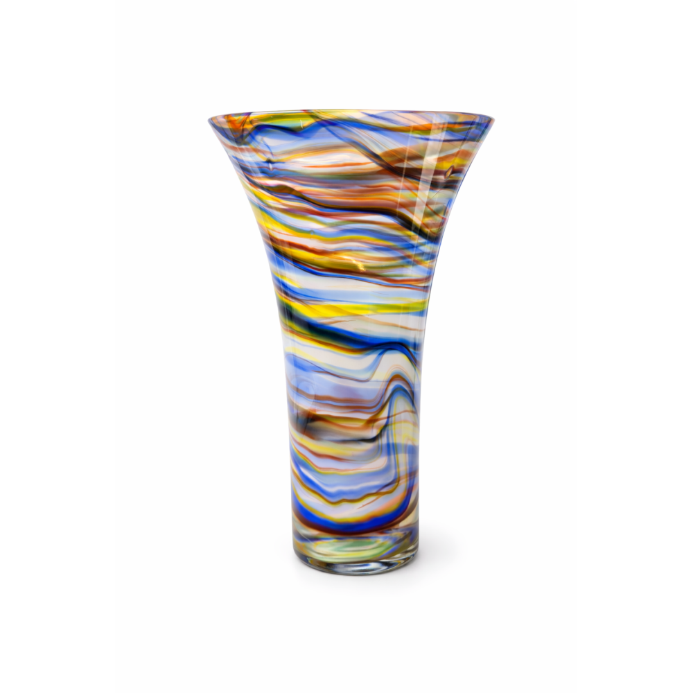 Wazon wykonany został z wysokiej jakości szkła i zachwyca artystycznym, wielobarwnym wzorem. Przenikające się odcienie niebieskiego, żółtego, czerwieni i bursztynu tworzą unikalną kompozycję przypominającą barwne szkło artystyczne.
