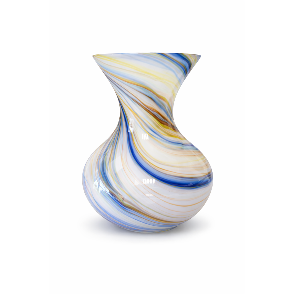 Wyjątkowy wazon szklany marki Krosno o wysokości 25 cm to elegancki element dekoracyjny, który przyciąga wzrok i nadaje wnętrzu artystycznego charakteru. Wykonany z wysokiej jakości szkła, zachwyca dynamicznym, wielokolorowym wzorem w odcieniach bieli, błękitu, żółci i ciepłych brązów.