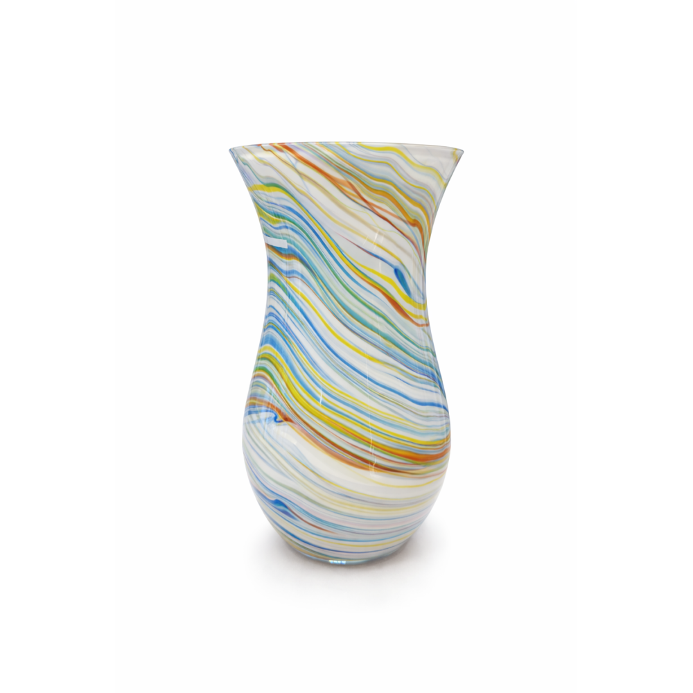 Stylowy wazon szklany marki Krosno o wysokości 25 cm to wyjątkowy element dekoracyjny, który przyciąga wzrok i podkreśla charakter wnętrza. Wykonany z wysokiej jakości szkła, zachwyca artystycznym wzorem w odcieniach błękitu, żółci, pomarańczu i delikatnej bieli.