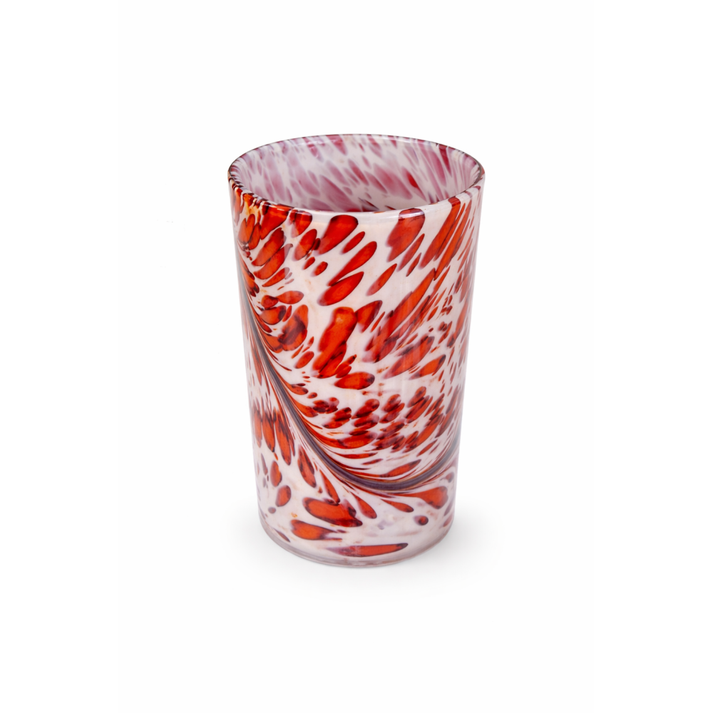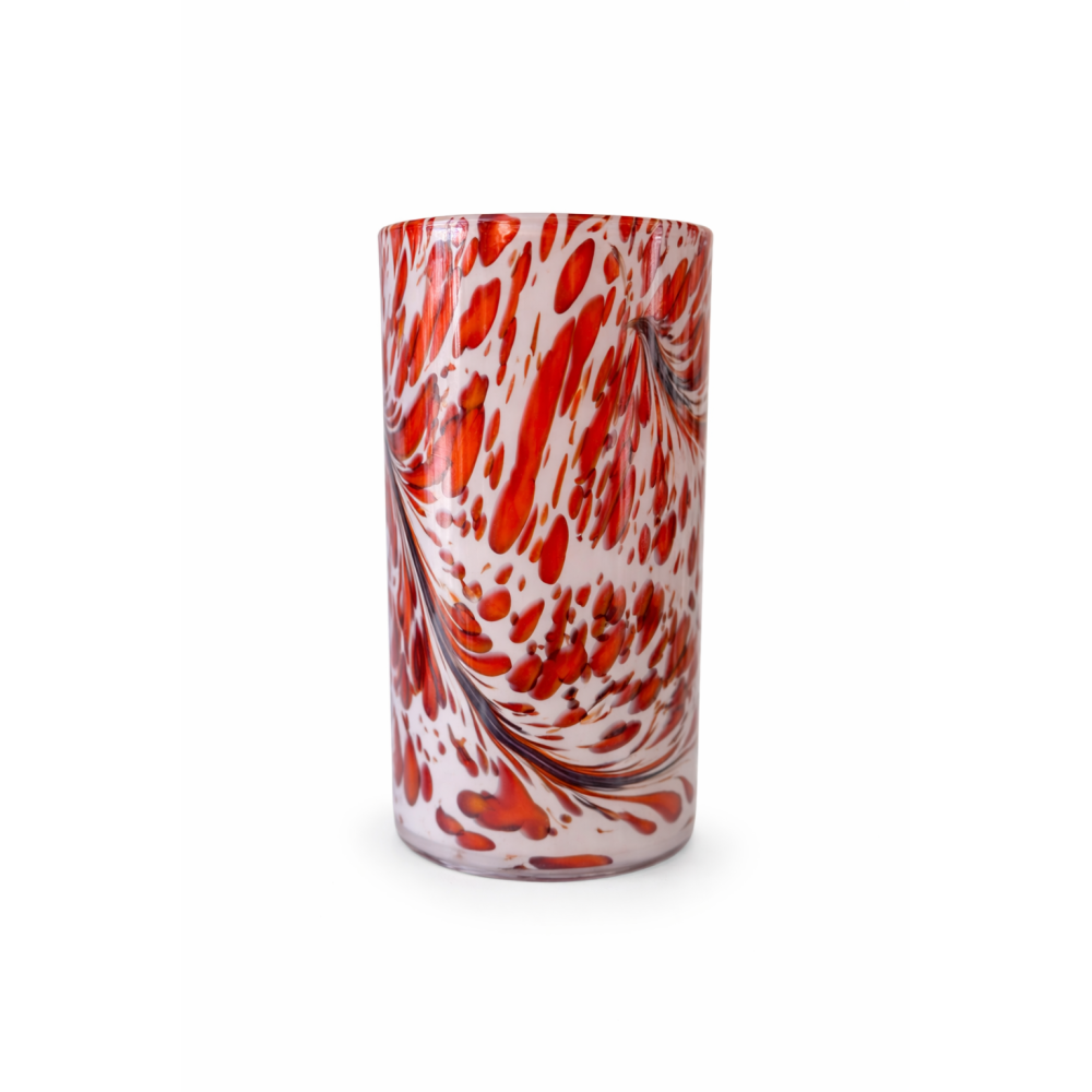 Efektowny wazon dekoracyjny o wysokości 20,5 cm to propozycja dla osób, które cenią oryginalne, artystyczne dodatki. Intensywne czerwone wzory zatopione w mlecznym szkle tworzą dynamiczną kompozycję, która przyciąga wzrok i nadaje wnętrzu wyjątkowego charakteru.