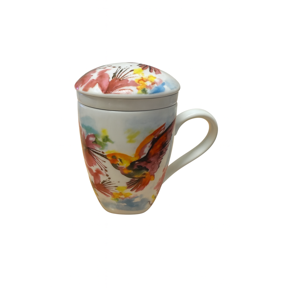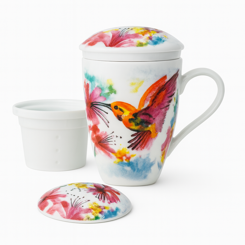Elegancki kubek z zaparzaczem z kolekcji „Koliber” marki Bogucice to doskonałe połączenie funkcjonalności i sztuki. Wykonany z wysokiej jakości porcelany, ozdobiony subtelnym motywem kolibra i kwiatów, wnosi do codziennych chwil wyjątkowy klimat natury i delikatności.