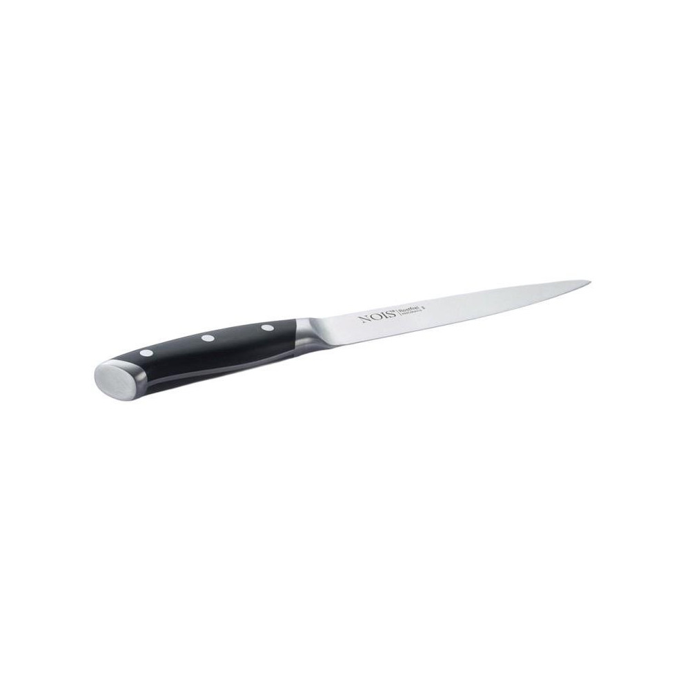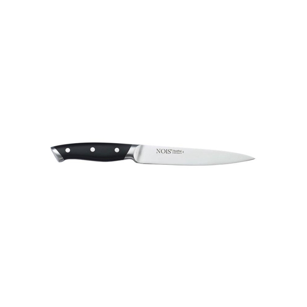 Uniwersalny nóż do wędlin marki NOIS z ostrzem 17 cm z walcowanej stali nierdzewnej X50CrMoV15 o twardości ok. 55 ± 1 HRC. Cienkie, gładko wypolerowane ostrze tnie precyzyjnie plastry bez miażdżenia struktury. Higieniczne połączenie ostrza z rękojeścią ułatwia czyszczenie, a wyważenie noża zapewnia komfort przy dłuższej pracy.