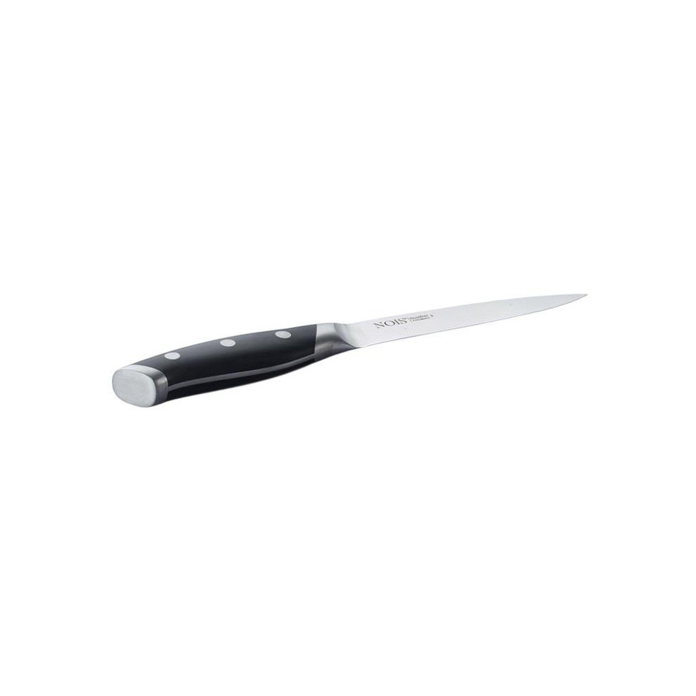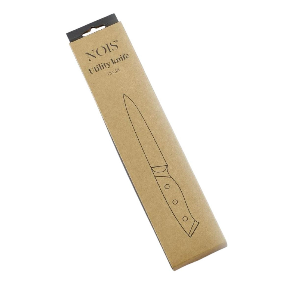 Praktyczny i elegancki nóż uniwersalny marki NOIS o długości ostrza 13 cm to niezbędny element wyposażenia każdej kuchni. Doskonale sprawdza się do codziennego krojenia warzyw, owoców, serów, wędlin czy pieczywa. Dzięki precyzyjnemu wykonaniu z wysokogatunkowej stali nierdzewnej, nóż łączy trwałość, funkcjonalność i stylowy wygląd.