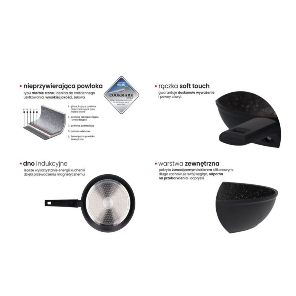 Uniwersalna patelnia FORTE została wykonana z nieprzetworzonego aluminium typu forged, czyli tłoczonego na gorąco. Wewnętrzną stronę patelni pokrywa innowacyjna, żelowa powłoka nieprzywierająca typu marble stone firmy PFLUON. Ze względu na swoje wyjątkowe właściwości i zwiększoną odporność na zarysowania powłoka ta stosowana jest w segmencie naczyń przeznaczonych do częstego, codziennego użytku. Patelnia doskonale akumuluje i przewodzi ciepło. Co więcej, nadaje się na wszystkie rodzaje kuchenek, w tym na płyty indukcyjne. Ponadto, patelnia posiada stosunkowo lekką wagę, co stanowi jej atut, dzięki któremu, podczas dłuższej pracy z naczyniem, nie odczujemy zmęczenia ręki. Zastosowaną rączkę wykonano z nieprzewodzącego ciepła tworzywa sztucznego. Co więcej, rączka posiada specjalną powłokę zapewniającą wygodny i pewny chwyt. Silikonowy lakier żaroodporny, który pokrywa zewnętrzną część patelni, powoduje, że naczynie zachowuje swój estetyczny wygląd przez długi czas.