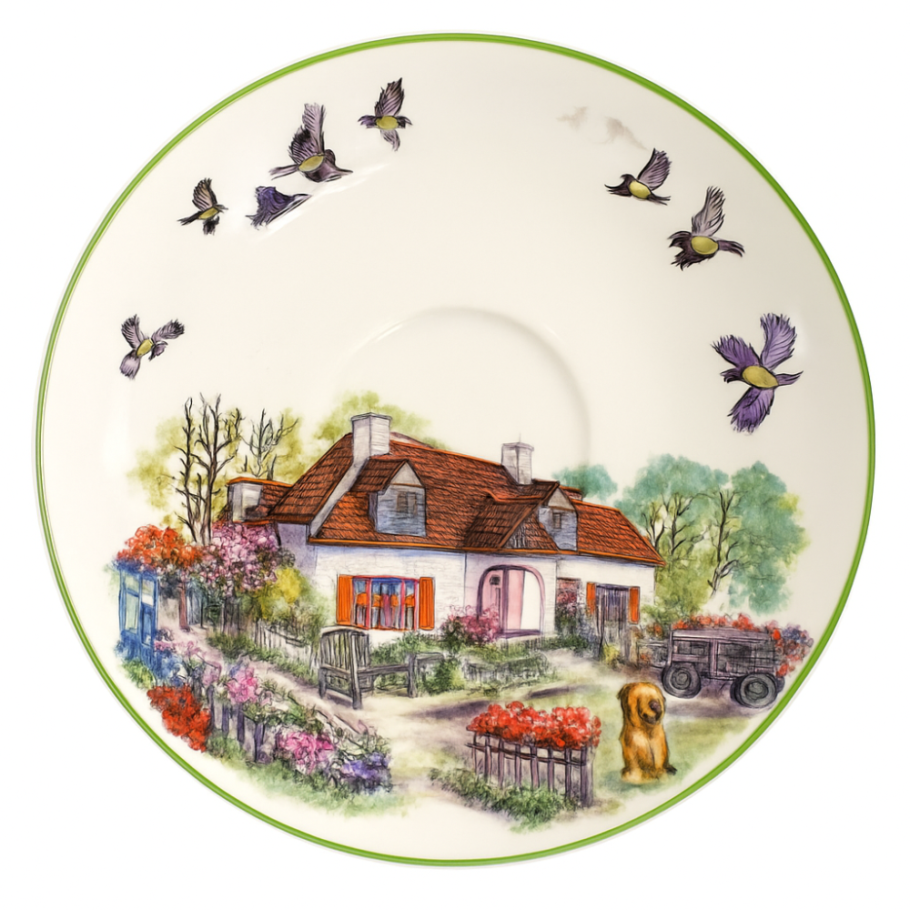To wyjątkowy komplet, który zachwyca eleganckim motywem malowniczego dworku w otoczeniu kwiatów i ogrodu — idealny dla miłośników stylu angielskiego oraz romantycznych detali w domowym wnętrzu.