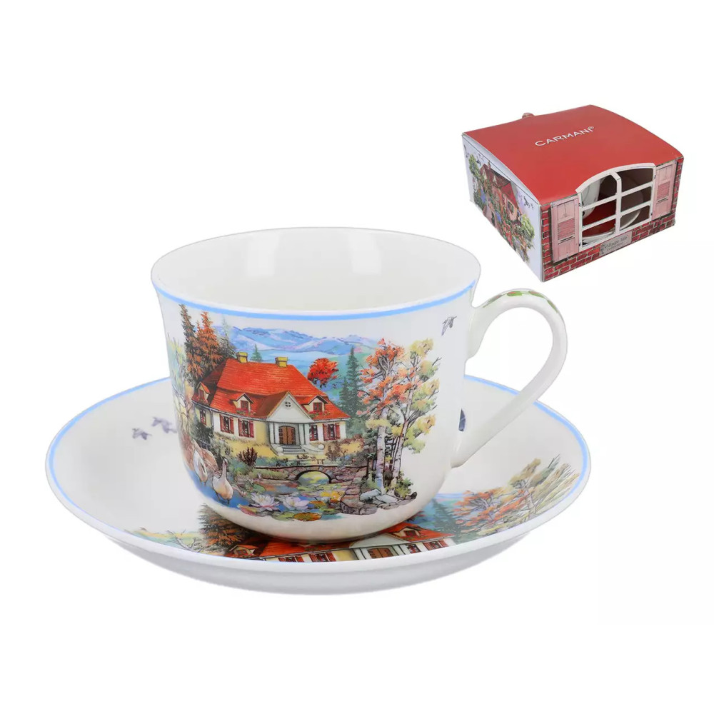 Porcelanowa filiżanka ze spodkiem 400 ml marki Carmani z kolekcji „Dworek nad stawem”. Motyw wiejskiego dworku w ogrodzie, możliwość mycia w zmywarce i użycia w mikrofalówce — elegancja i funkcjonalność w jednym.