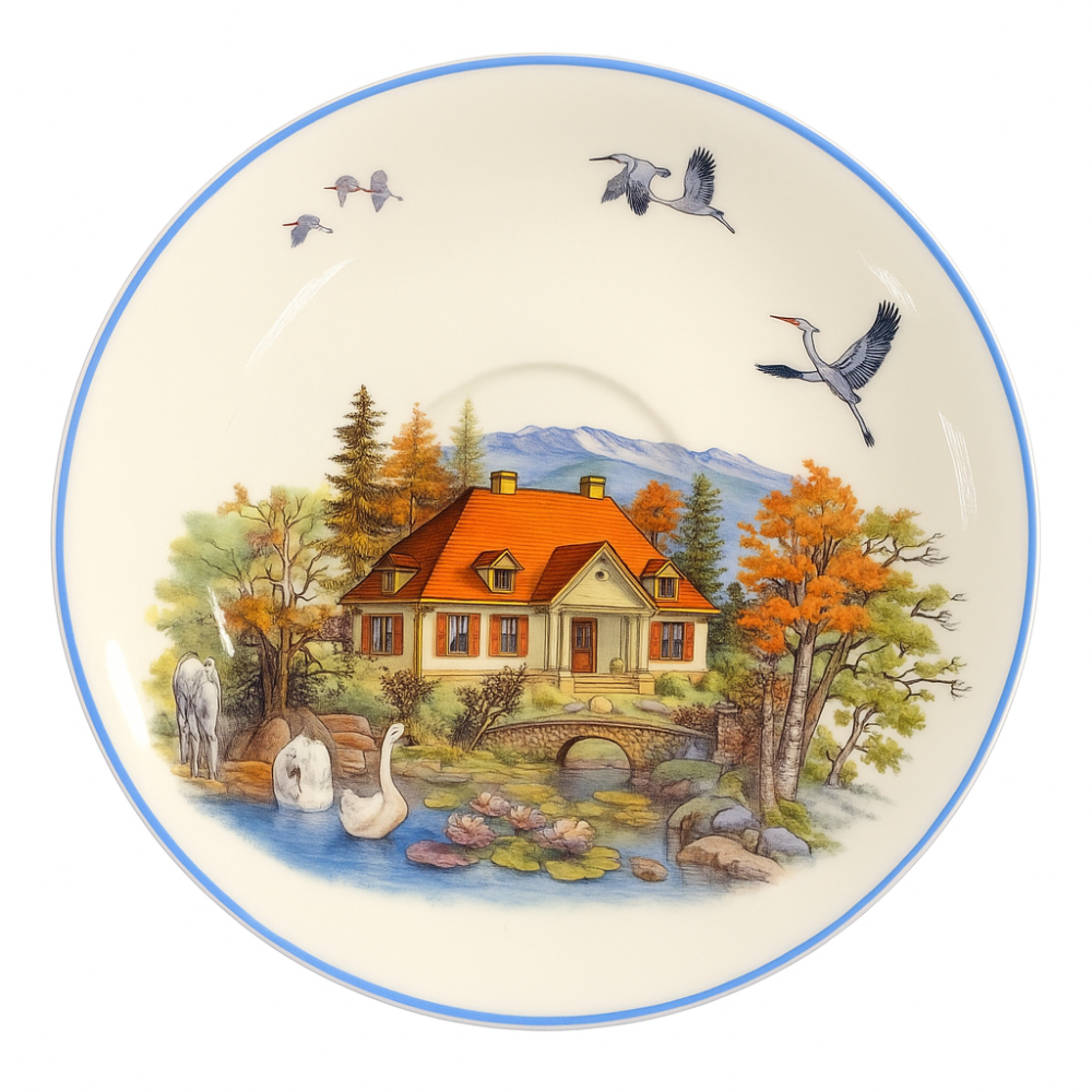 Zapraszamy do świata spokojnej elegancji z filiżanką ze spodkiem „Dworek nad stawem” marki Carmani. Wykonana z wysokiej jakości porcelany, prezentuje urokliwy motyw wiejskiego dworku otoczonego bujną zielenią, ogrodem i ptakami — idealna dla tych, którzy cenią styl angielski oraz subtelne dekoracje w kuchni lub jadalni.