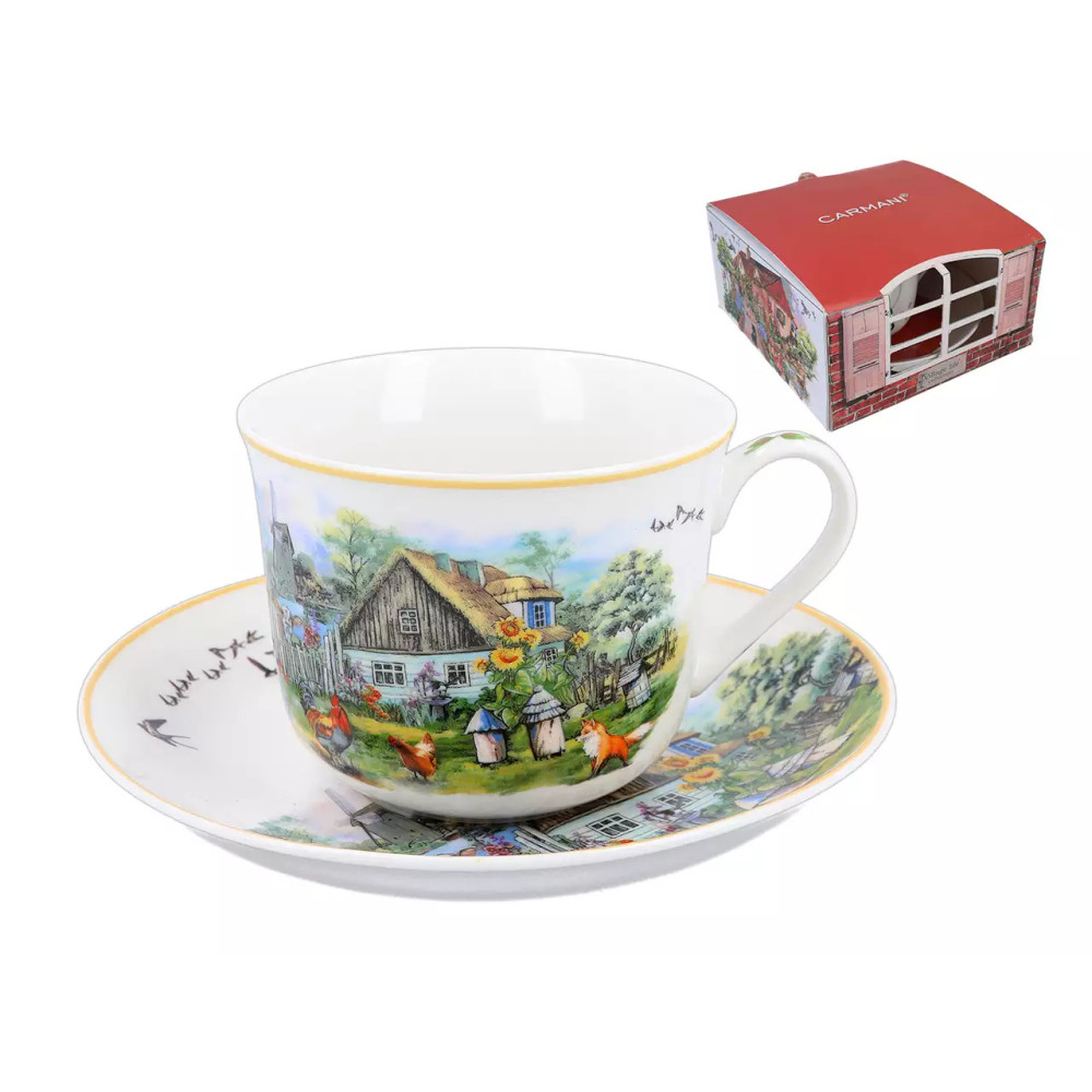 Porcelanowa filiżanka ze spodkiem 400 ml marki Carmani – model „Wiejska zagroda”. Motyw wiejskiego dworku i ogrodu, idealna do codziennego użytku oraz jako elegancki prezent.