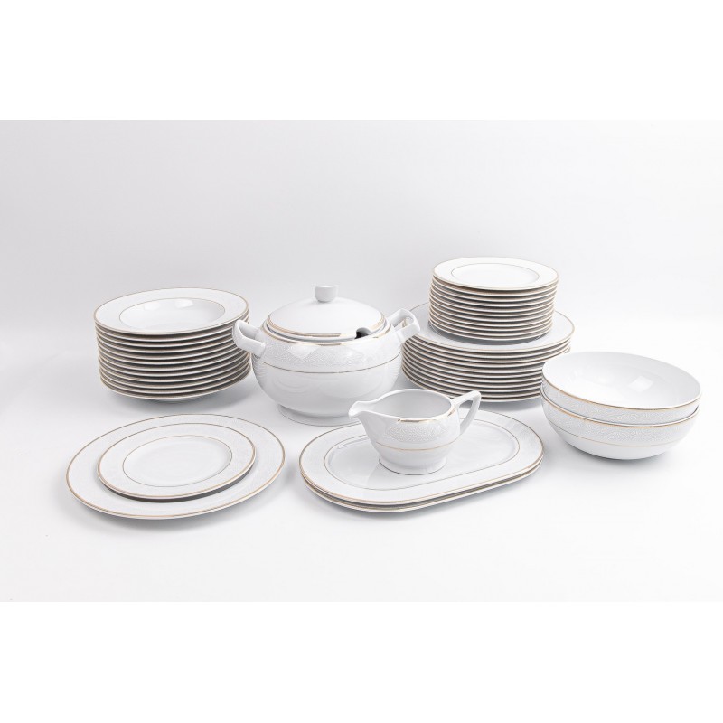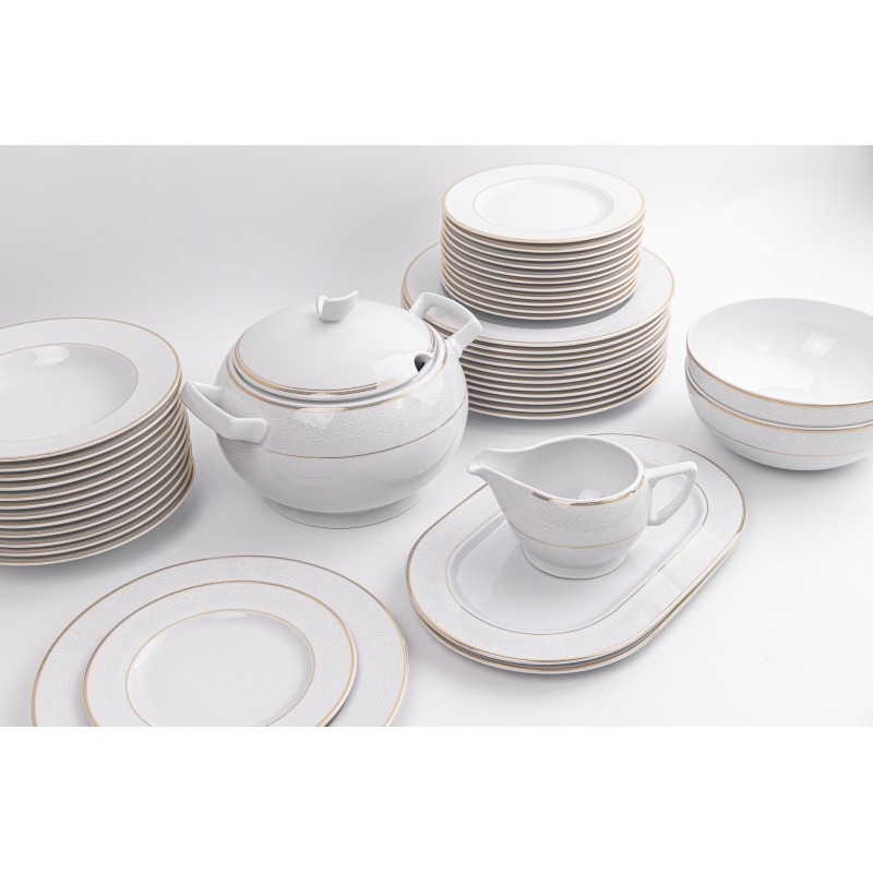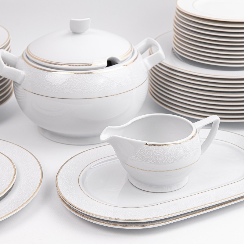 Wprowadź do swojego domu elegancję i luksus dzięki wyjątkowemu zestawowi porcelany WAZA z kolekcji Gracja WA-151 Ambasador. Biały korpus porcelany zdobiony subtelnym wzorem i akcentem złotej linii sprawia, że każdy stół zyskuje wyjątkową oprawę — idealną na uroczystości, święta i rodzinne posiłki.