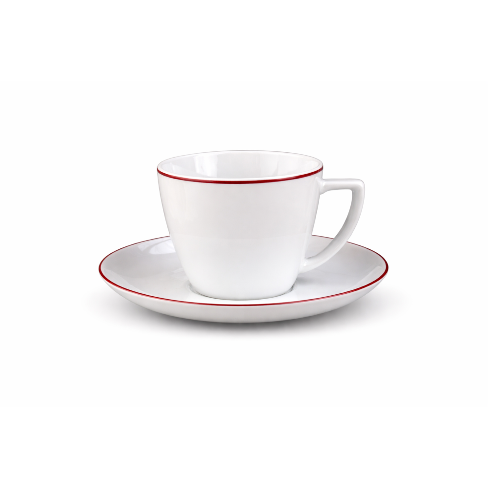 Stylowa filiżanka 350 ml ze spodkiem z kolekcji Waza Modern to doskonała propozycja dla osób, które cenią minimalistyczne wzornictwo, wysoką jakość wykonania i eleganckie detale. Klasyczna biała porcelana została ozdobiona subtelną bordową linią, która nadaje całości nowoczesnego i wyjątkowo estetycznego charakteru.