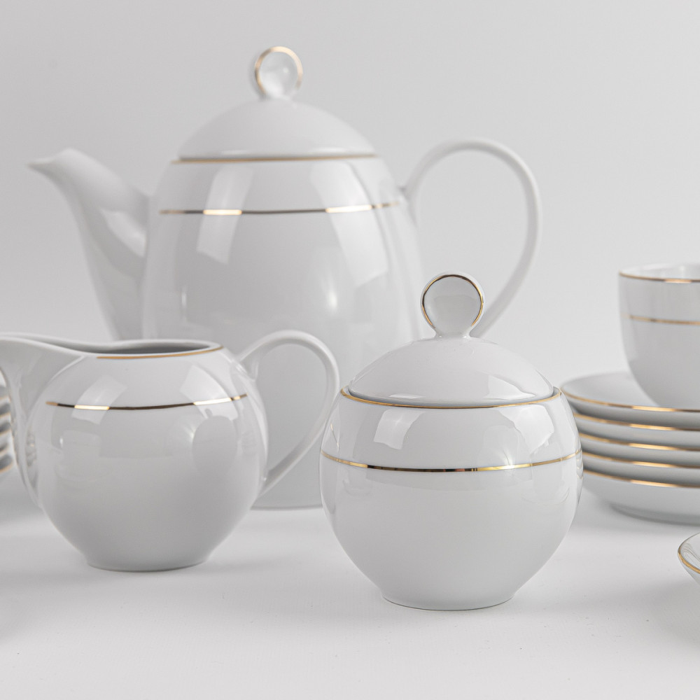 Wyjątkowy serwis kawowy marki WAZA, w wersji dekoracyjnej „Złoty Rant / Złoty Pasek” oznaczonej symbolem WA-08zł, to elegancki zestaw wykonany z wysokiej jakości porcelany z wyraźnym złotym rantem i złotym paskiem wokół napojowych elementów. Idealny wybór na wyjątkowe okazje — święta, rodzinne spotkania, uroczystości — a także jako luksusowy prezent.