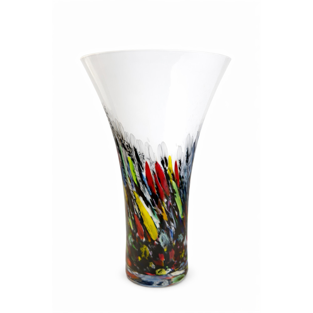 Dolna część wazonu zdobiona jest dynamiczną kompozycją intensywnych kolorów – czerwieni, zieleni, żółci, niebieskiego oraz czerni. Kolorowe elementy pięknie kontrastują z przejrzystą górną częścią wazonu, dzięki czemu całość prezentuje się bardzo elegancko i nowocześnie.